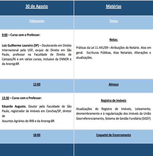 A programação traz temas como “Registro de Imóveis”, “Protesto da Dívida Ativa”, “Registro Civil das Pessoas Naturais”, “Notas”, entre outros.