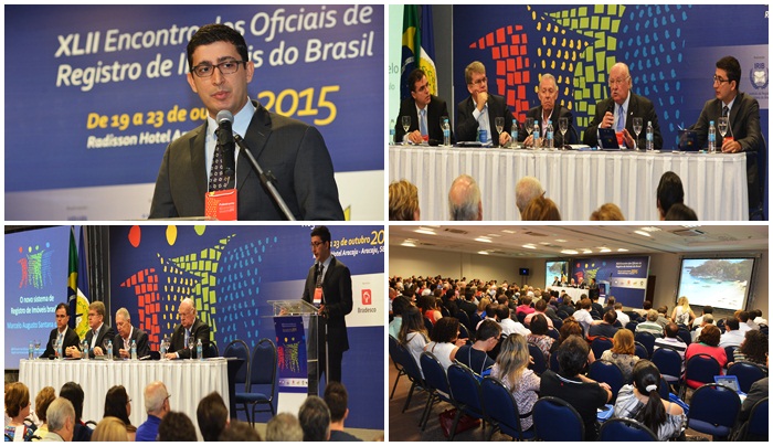O diretor de Meio Ambiente do IRIB e registrador de imóveis em Araçatuba/SP, Marcelo Augusto Santana de Melo, abordou o tema “O novo Registro de Imóveis brasileiro - Lei nº 13.097/2015”, abrindo o terceiro dia de palestras do XLII Encontro Nacional do IRIB, que acontece em Aracaju/SE.
