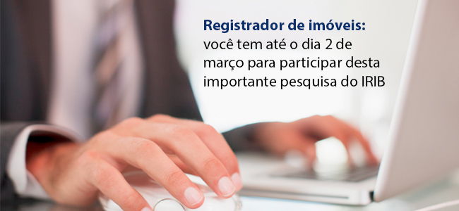 Assim, como entidade de representação político-institucional da classe registral imobiliária em âmbito nacional, o INSTITUTO DE REGISTRO IMOBILIÁRIO DO BRASIL (IRIB) solicita a TODOS os registradores, associados ou não, que respondam à pesquisa disponibilizada neste link até o dia 2 de março do corrente ano.