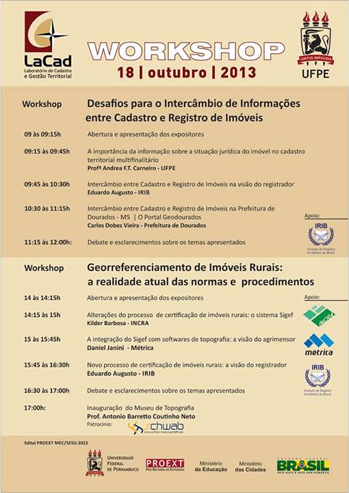 O Laboratório de Cadastro e Gestão Territorial (LaCad) do Departamento de Engenharia Cartográfica da Universidade Federal de Pernambuco promove amanhã, 18/10, os Workshops ‘Desafios para o Intercâmbio de Informações entre Cadastro e Registro de Imóveis’ e ‘Georreferenciamento de Imóveis Rurais – a realidade atual das normas e procedimentos’. O evento será realizado no auditório do Centro de Tecnologia e Geociências da UFPE e conta com o apoio do IRIB.